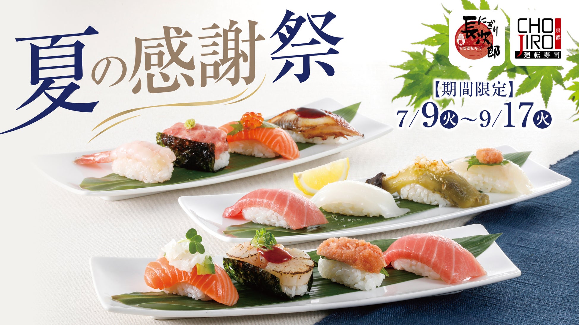 株式会社フーズネット(本社・⼤阪府⼤阪市、代表取締役社⻑・加藤誠)が運営する「活⿂廻転寿司にぎり⻑次郎」 「廻転寿司CHOJIRO京都」は、7月9日(火)から「夏メニュー -第1弾-」と「夏の感謝祭」を同時開催いたします。