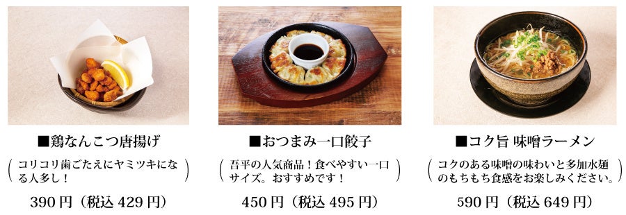 の居酒屋の先駆けとしてスタートしたとりあえず吾平は、個室感のある客席が人気で、若者からご年配まで、ご家族連れや地域での集まりなど、幅広いお客様層やシチュエーションにてご利用を頂いております。フード、ドリンクのメニューはリーズナブルなお値段で、全メニューの約7割が一品390円(税別)以下でお楽しみいただけます。また、郊外型居酒屋店ならではの特徴として、お車でお越し頂くお客様にも楽しんで頂けるようノンアルコールカクテルやノンアルコールドリンクの品揃えが充実しております。フードメニューも数多い商品を取り揃え、食事のみでのご来店のお客様にも喜んで頂けるメニュー構成となっております。