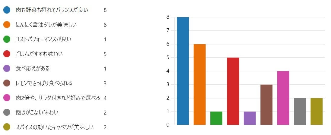 最も多くの票を集めたのは『肉も野菜も摂れてバランスが良い』というポイントでした。以下2位は『にんにく醤油ダレが美味しい』、『ごはんがすすむ味わい』でした。