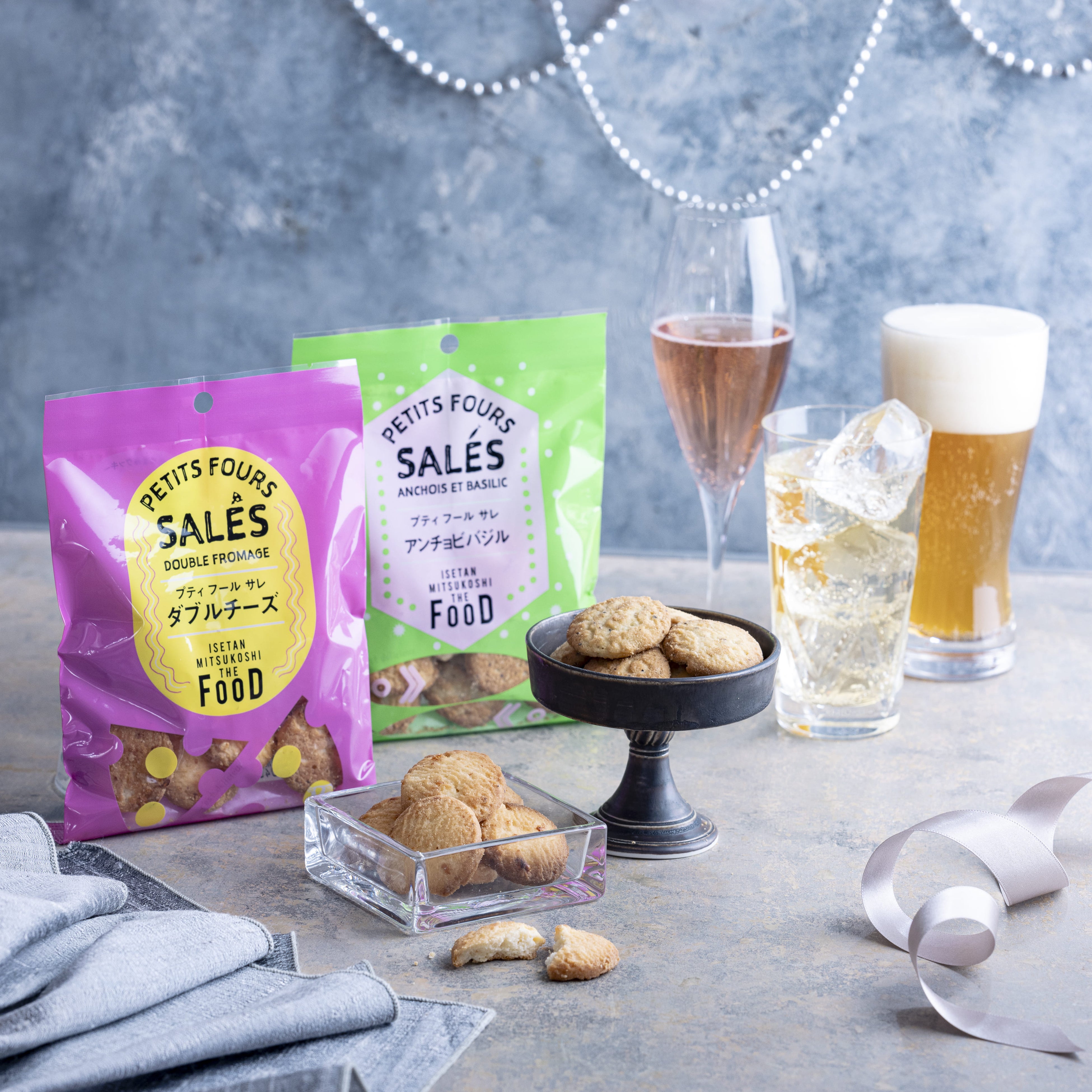 「プティフールサレ ダブルチーズ」は2種類のチーズを配合した、濃厚なチーズの風味を楽しめるクッキーです。程よい塩気はお酒との相性抜群で、特にビールやハイボールと合わせるのがおすすめ!