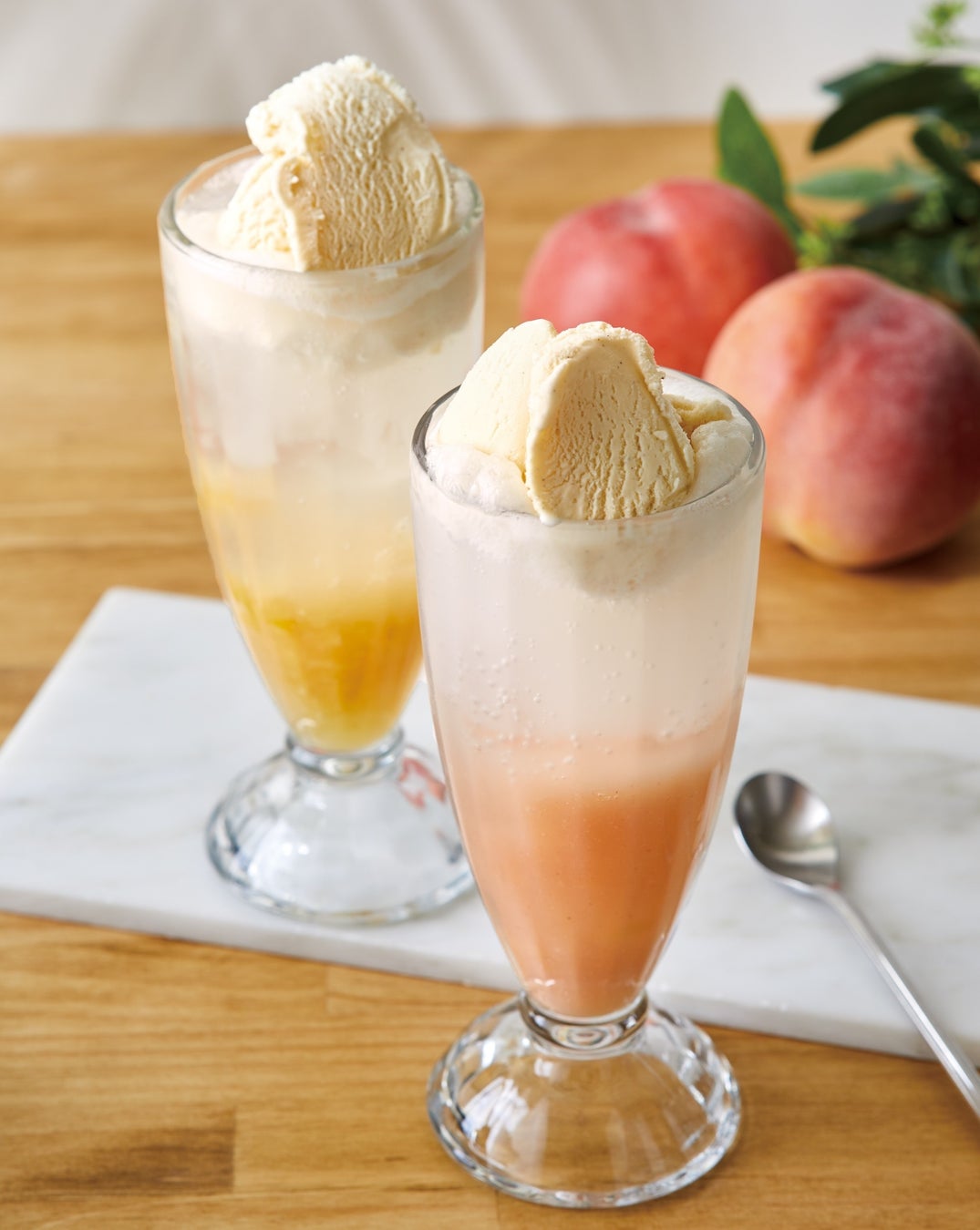 桃のピューレ入りのソーダに、ミルクバニラアイスをあわせました。