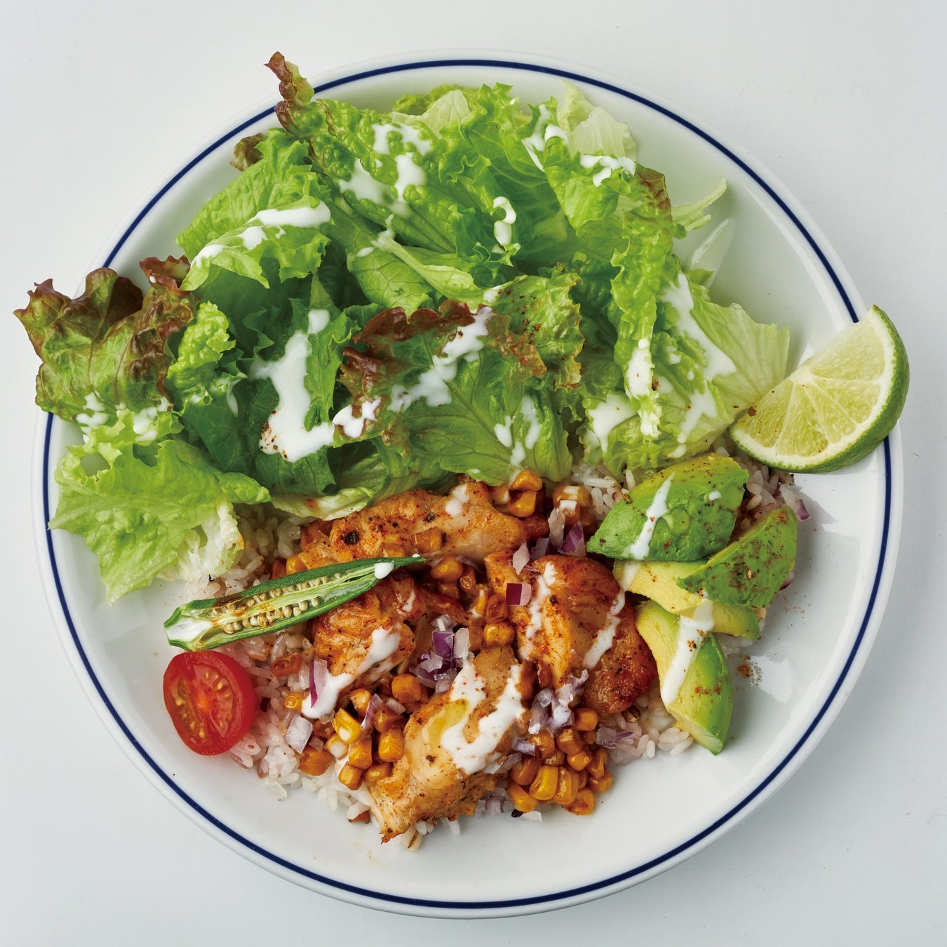 スパイス香るケイジャンチキンとアボカド、オクラ、コーンに酸味のあるヨーグルトドレッシングを合わせました。ライムを絞ってお召し上がりください。