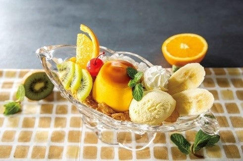 口当たりの滑らかなプリンにオレンジやキウイなどのフルーツとホイップクリームを盛り付けました。昭和レトロな可愛い逸品です。