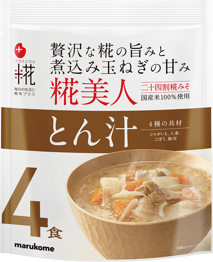 やさしい甘みの「糀美人」と、深いコクが特徴の「糀美人熟甘」をブレンドして奥深い味わいに仕上げました。煮込んだたまねぎを合わせ、野菜の甘みと旨みをプラス。甘いとん汁が好きな方も旨みやコクが強いとん汁が好きな方にも、満足してもらえる味を目指しました。外袋は環境に配慮した紙資材です。