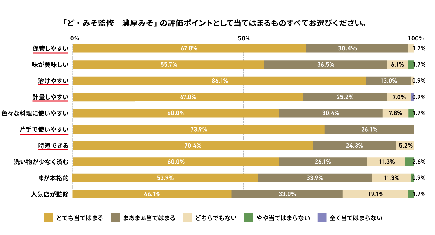 テストモニターで、「濃厚みそ」の味や使い勝手など10項目について「とても当てはまる」~「まったく当てはまらない」の5段階で評価してもらいました。その結果、「とても当てはまる」の回答率が高かった評価項目は、「溶けやすい」(86.1%)が最多となり、次いで「片手で使いやすい」(73.9%)「時短できる」(70.4%)「保管しやすい」(67.8%)「計量しやすい」(67.0%)となり、生みそにはない液みそならではの特徴が高く評価されていることがわかりました。