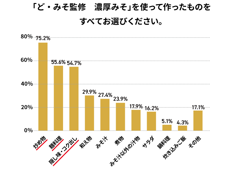 料理SNS「スナップディッシュ」を運営するスナップディッシュ株式会社(本社:東京都武蔵野市、代表取締役:舟田善)協力のもと、同アプリのユーザーを対象に発売前の「液みそ ど・みそ監修 濃厚みそ」でテストモニターを実施しました。「濃厚みそ」を使った料理を回答してもらったところ、「炒め物」(75.2%)、「麺料理」(55.6%)、「隠し味・コク出し」(54.7%)が上位となりました。「その他」の回答では手づくりのソースやタレ、つけだれやディップなどに非加熱のまま使用する場合や、焼きおにぎりなどの焼き物、肉や魚の下味など、「万能調味料」として幅広い用途に使われていました。