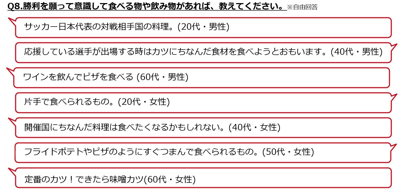 また「ワイン」「スイーツ」「パン」など開催国を意識したメニューを具体的にあげる方も複数。今回の調査で尋ねた開催地にちなんだ料理の興味度は6割弱ありましたが、自由回答からも開催国のメニューへの関心の高さがうかがえる結果となりました。