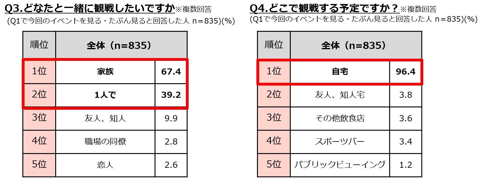 (3)観戦時に一緒に見たい相手は「家族」が67%で、「1人で」が39%。