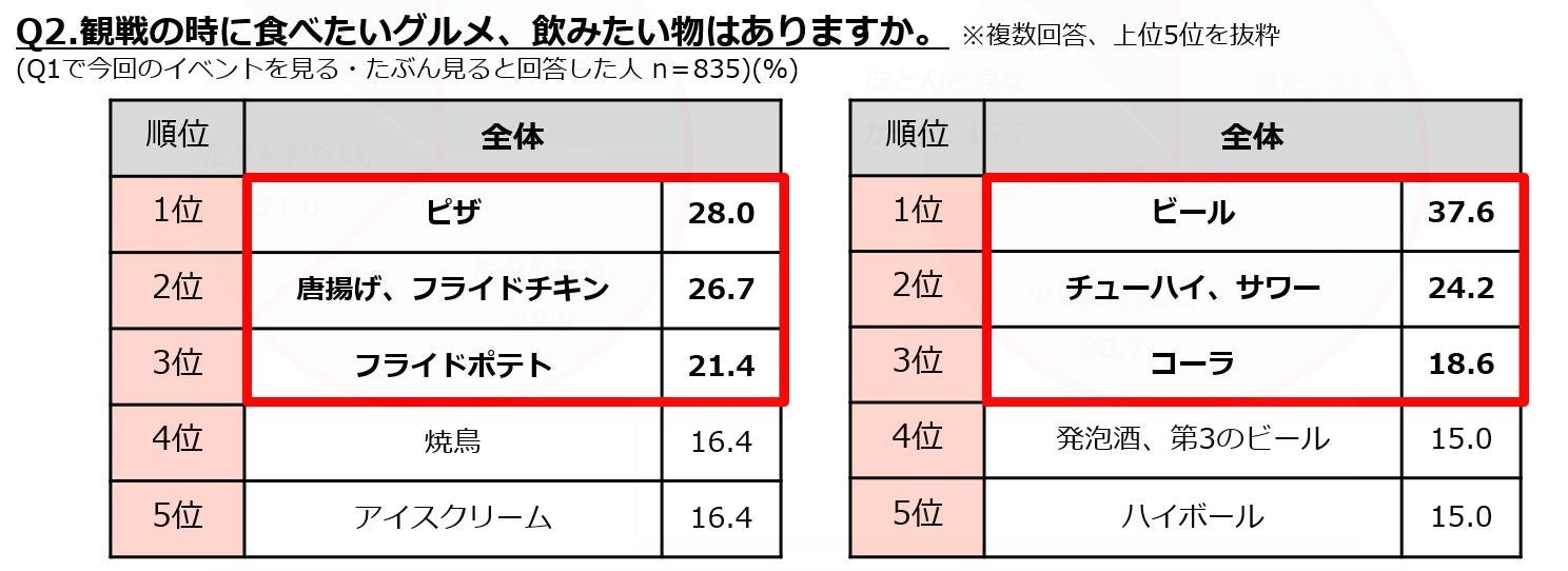 (2)観戦時に食べたいものTOP3は「ピザ」「唐揚げ、フライドチキン」「フライドポテト」。飲みたいものTOP3は「ビール」「チューハイ、サワー」「コーラ」。