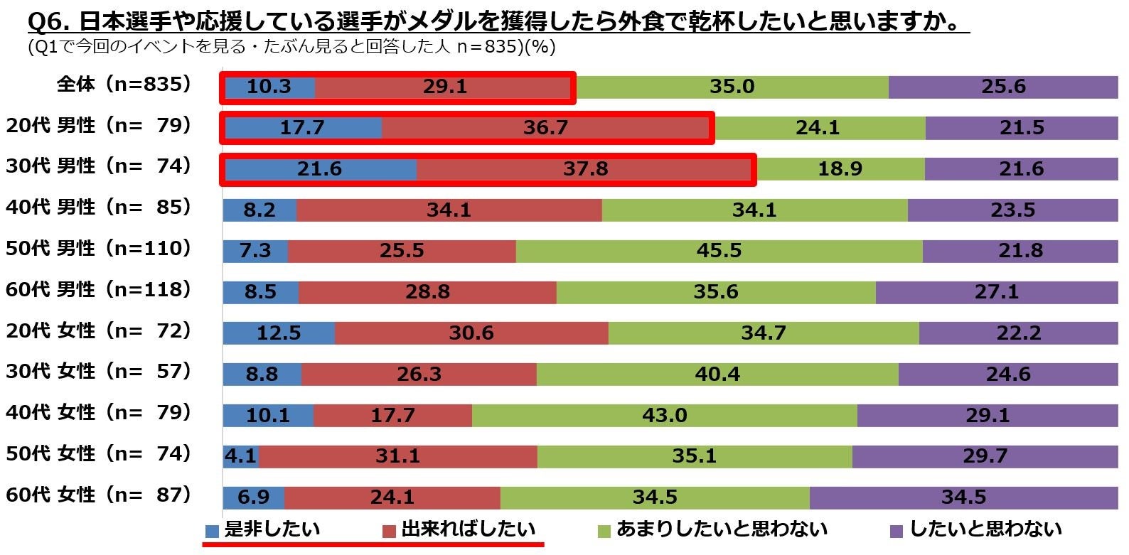 (6)日本選手や応援している選手が上位に入ったら「外食で乾杯したい」と思う人は39%で、特に20~30代男性は5割以上と高い。