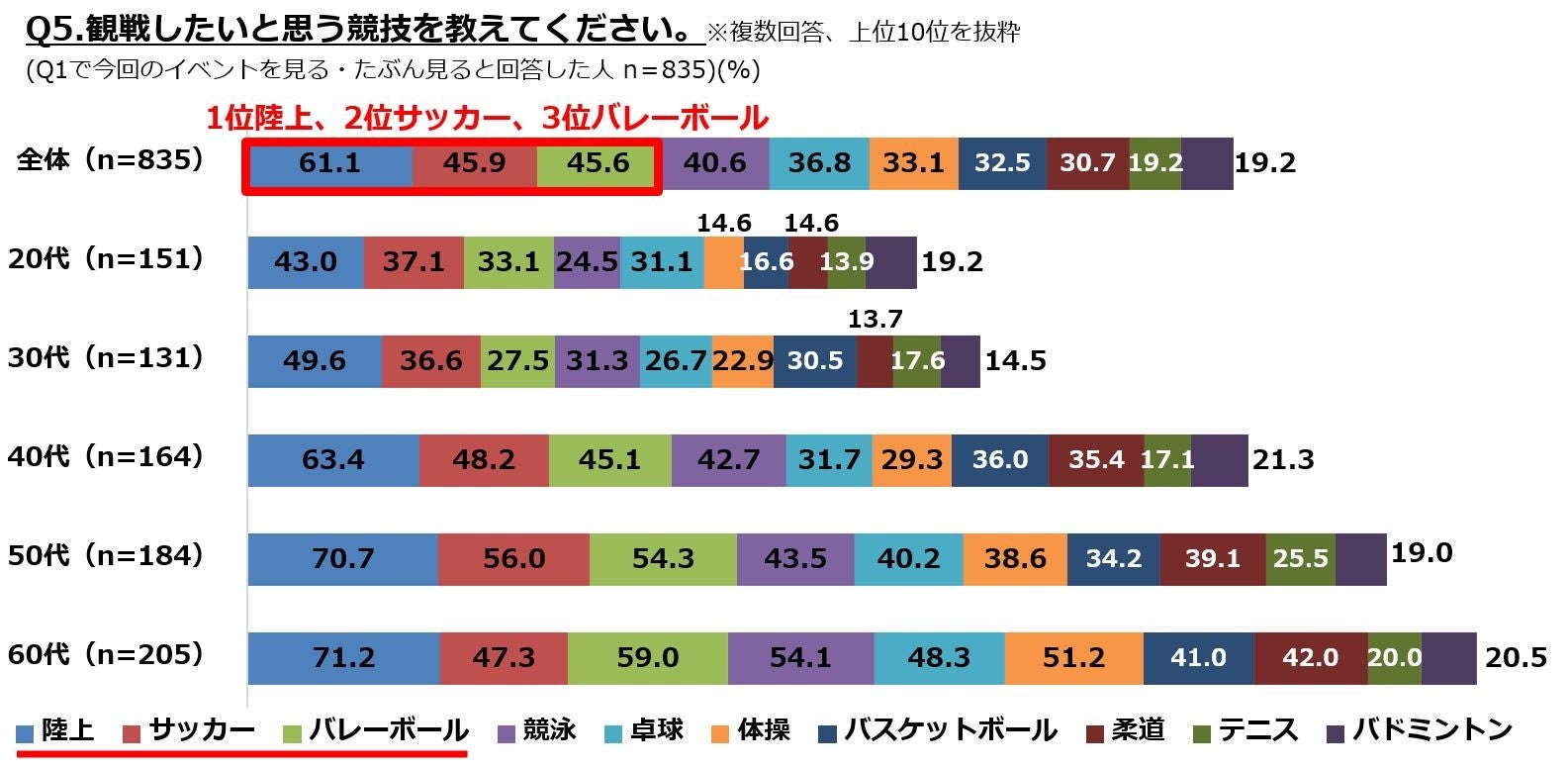 (5)観戦したい競技は「陸上」「サッカー」「バレーボール」がTOP3。