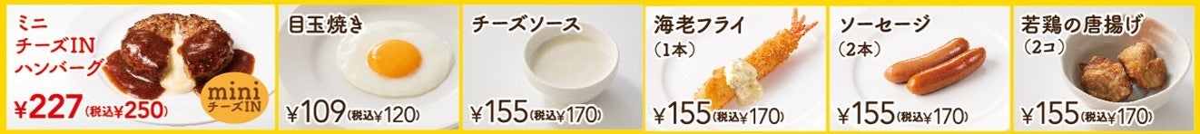 ミニチーズINハンバーグ(250円)、目玉焼き(120円)、チーズソース(170円)、海老フライ1本(170円)、ソーセージ2本(170円)、若鳥の唐揚げ2コ(170円) -