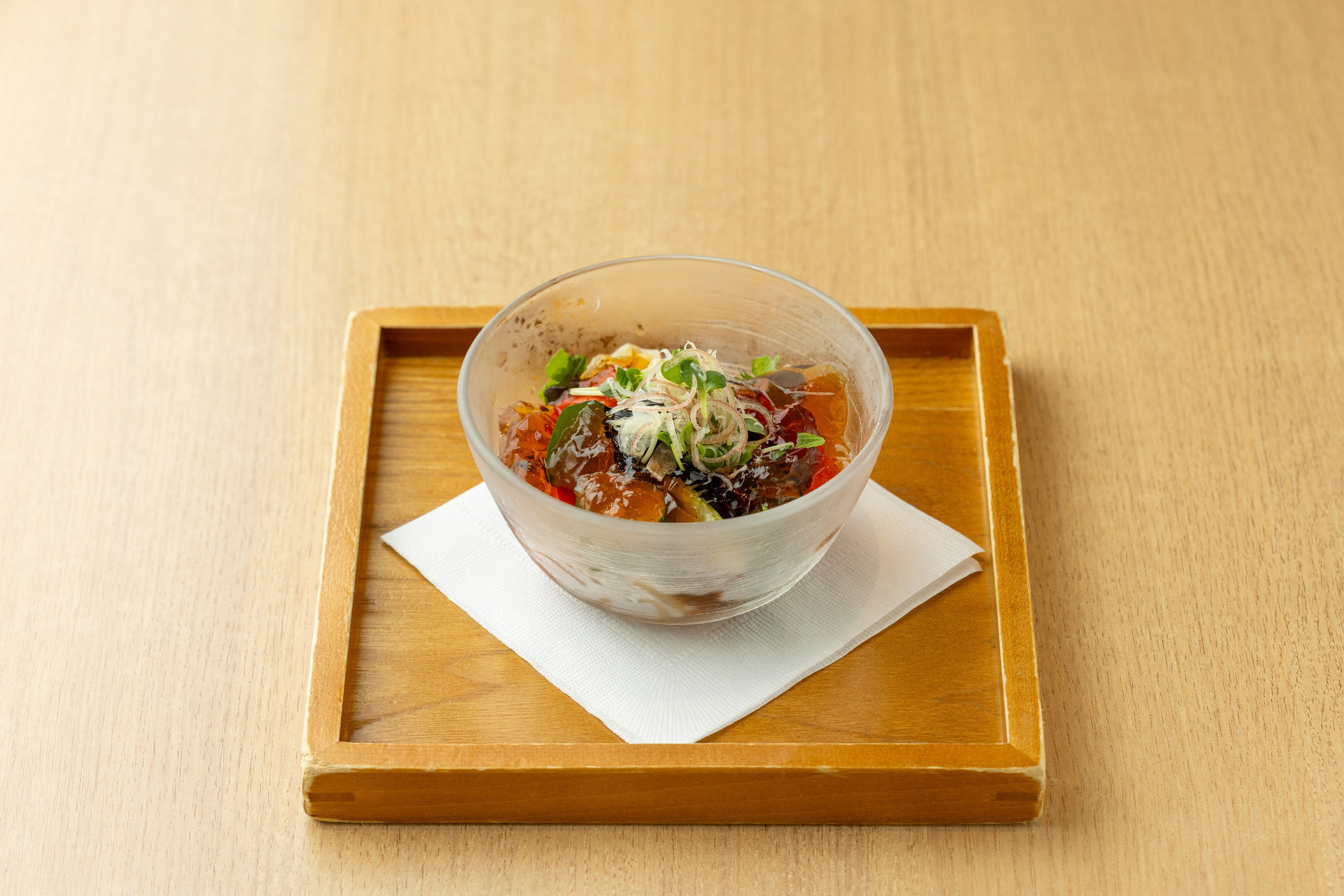 夏野菜はそれぞれさっと火入れし、本枯鰹節だしを使用した土佐酢に漬け込みました。盛り付け時に土佐酢をジュレ状にしたものもかけているので、かつお節だしをたっぷりと堪能していただきたいです。