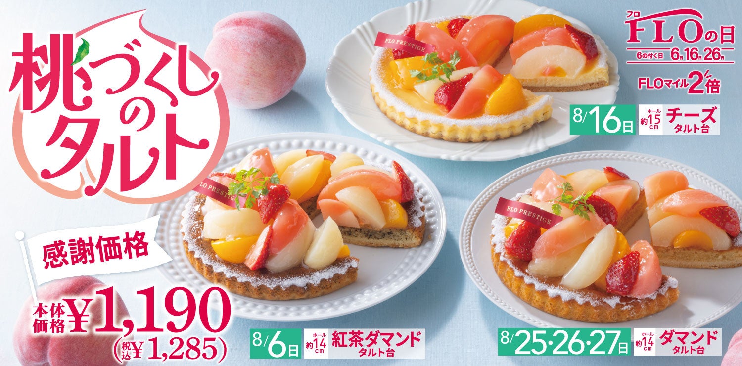 7月に続き、昨年大好評・完売続出の「桃づくしのタルト」が、2024年Ver.にリニューアルして登場!優しい甘さの3色の桃をたっぷりとトッピングした直径約14~15cmのホールタルトを、FLOの日限定価格・税込1,285円で販売いたします。