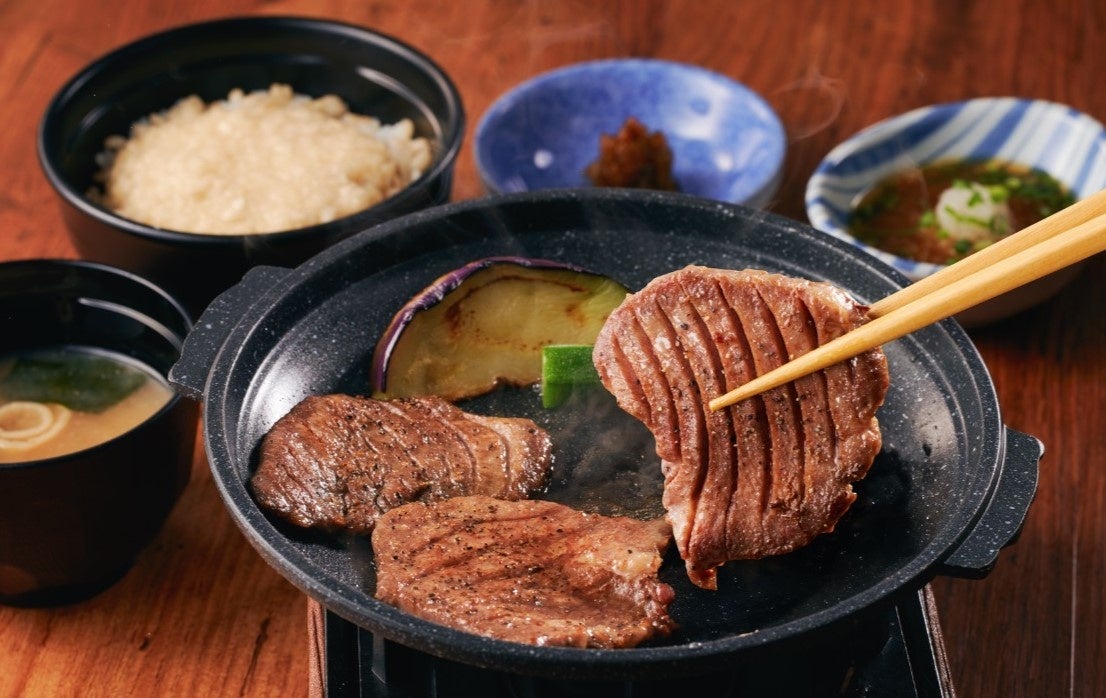 食感にこだわった厚切り牛タンを卓上で焼き、アツアツでどうぞ。相性抜群のおろしポン酢、とろろ、もち麦のせ御飯、山形県庄内産の肉厚な青唐辛子を熟成発酵させた「南蛮味噌」まで付いた大満足な御膳です。