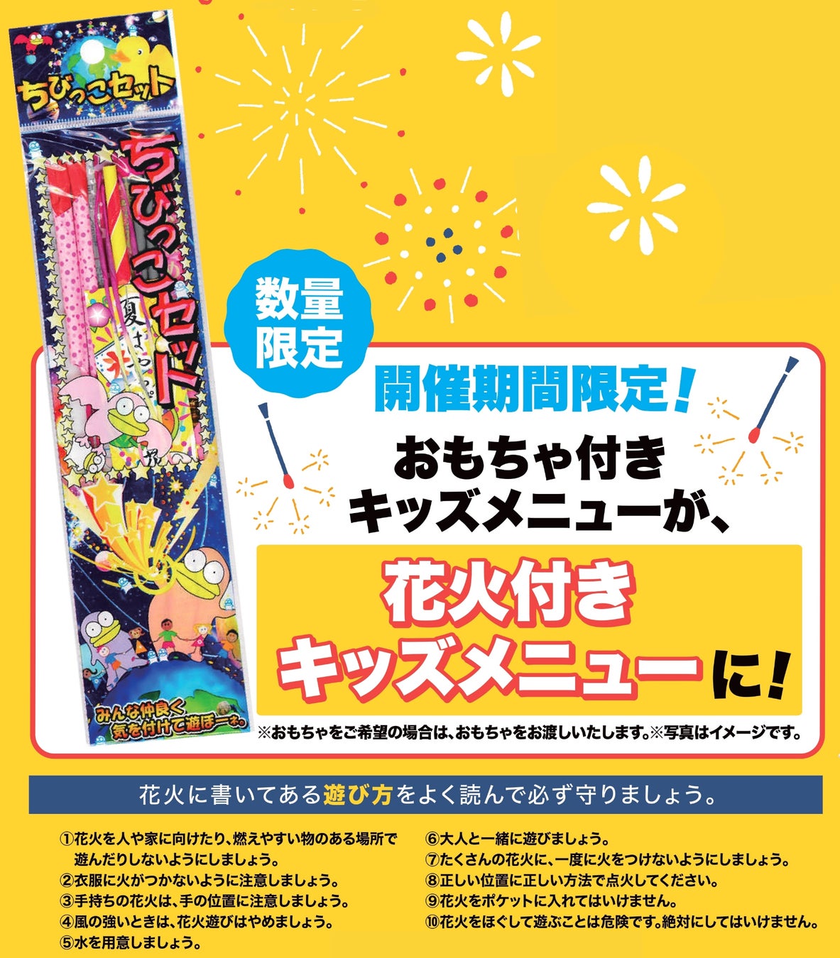 ステーキ宮では、小学生以下のお子様限定「おもちゃ付きキッズメニュー」を販売しております。なんと、その「おもちゃ付きキッズメニュー」が、“キッズまつり”開催期間限定で「花火付きキッズメニュー」となります。キッズメニューをご注文いただくと花火セットをプレゼントいたします。夏の風物詩、キラキラきれいな花火で、夏