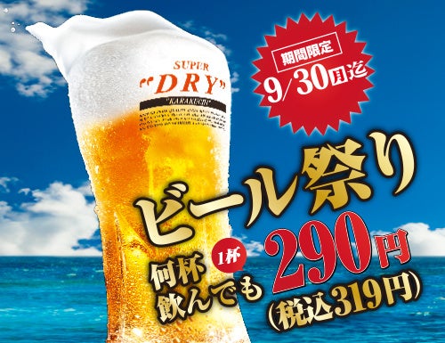 ビール祭り開催により、生ビール何杯飲んでも1杯290円(税込319円)により、大変お得にお楽しみ頂けます。