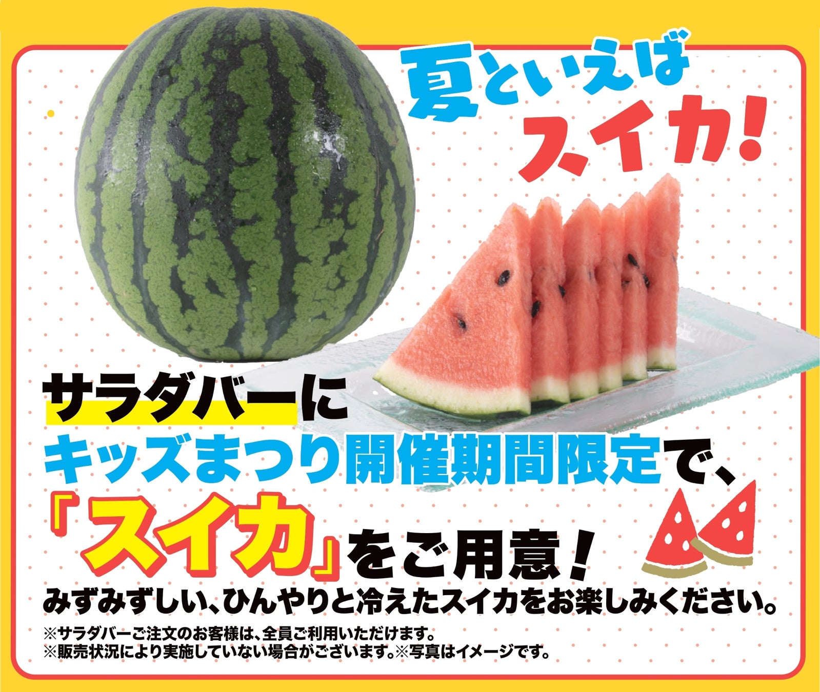キッズまつり開催期間限定で、サラダバーに「スイカ」をご用意いたしました。夏になると食べたくなる、みずみずしい、ひんやりと冷えたスイカをお好きなだけお楽しみください。夏の暑さもひんやり和らげてくれます。
