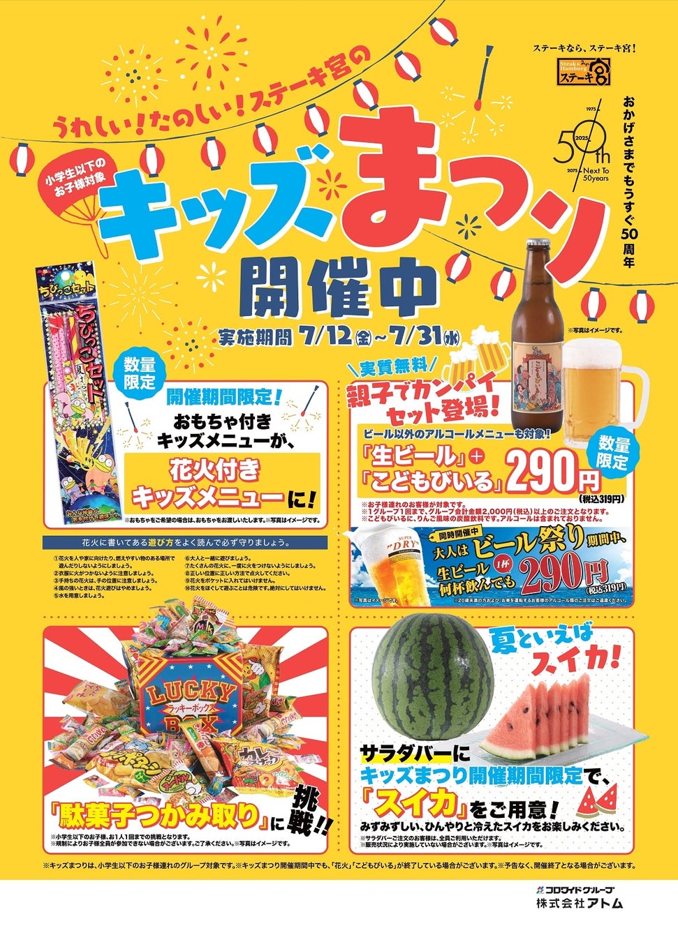 コロワイドグループの株式会社アトム(本社:神奈川県横浜市、代表取締役社長:田中公博)は、「ステーキ宮」113店舗で2024年7月12日(金)~7月31日(水)の期間で小学生以下のお子様を対象に「キッズまつり」を開催いたします。おかげさまでステーキ宮は、2025年で創業50周年を迎えます。それからもうすぐ50年、地域の多くの皆さまと「誕生日のお祝いは、家族でステーキ宮」などさまざまなシーンで、ステーキ宮は、ご一緒させていただきました。ご家族でよりこの夏をお楽しみ頂けるよう、お子様がワクワクする特典を4つご用意いたしました。