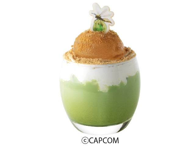 回復ミツムシをプルプルの水わらび餅で表現しました。はちみつ入り抹茶ミルクの甘美な味わいで、体力が回復するかも?