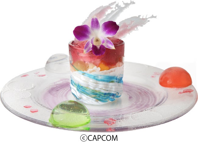 タマミツネの妖艶な体の色や泡をブドウゼリーやパンナコッタ、フルーツカクテルで表現したパフェ。泡狐竜の紫上毛に見立てた飴細工をトッピングしました。