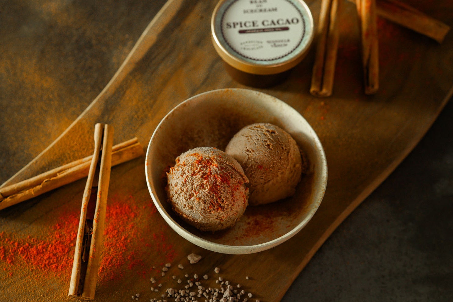 ヨーグルトやレモングラスのような華やかな酸味と芳しい香りのアナマライ, インド 70%のチョコレートの特徴を際立たせるべく、シナモンやオレンジの皮、さらにはエスプレットペッパーなど数種類のスパイスでアレンジした、複雑でスパイシーなチョコレートアイス。辛味の効いた大人の逸品です。