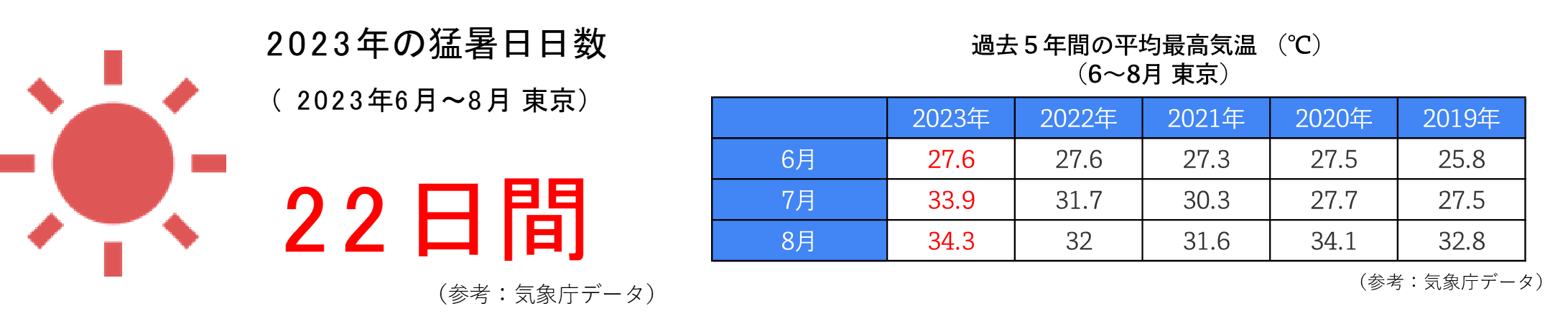 ●気象庁のデータでは、2023年6〜8月の猛暑日(最高気温が35℃以上)が22日間を記録し、平均最高気温も過去5年間を見ても最も高い数値となり、暑さは高まる傾向。