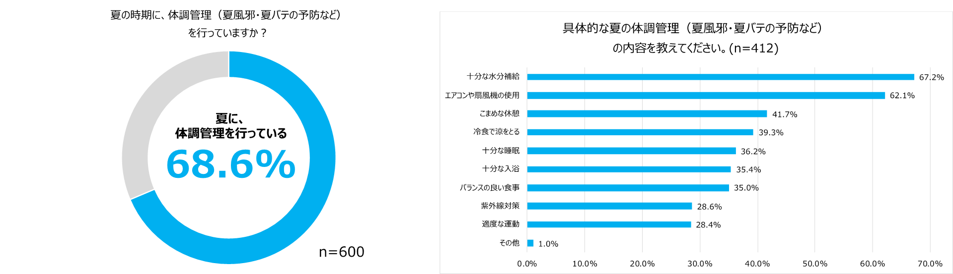 調査対象者の約7割が、「夏に、体調管理を行っている」と回答しました。主な対策方法として、「十分な水分補給」(67.2%)、「エアコンや扇風機の使用」(62.1%)、「こまめな休憩」(41.7%)が多く挙げられました。さらに 「夏に、体調管理を実施している」人への調査では、78.6%が「夏の体調管理は十分にできていると思う」と回答している一方で、それ以上の85.5%が「今の体調管理だけでは不安がある」と回答していることも分かりました。年々暑さが増す中で、夏の体調管理に不安を持つ人が多いことがうかがえます。