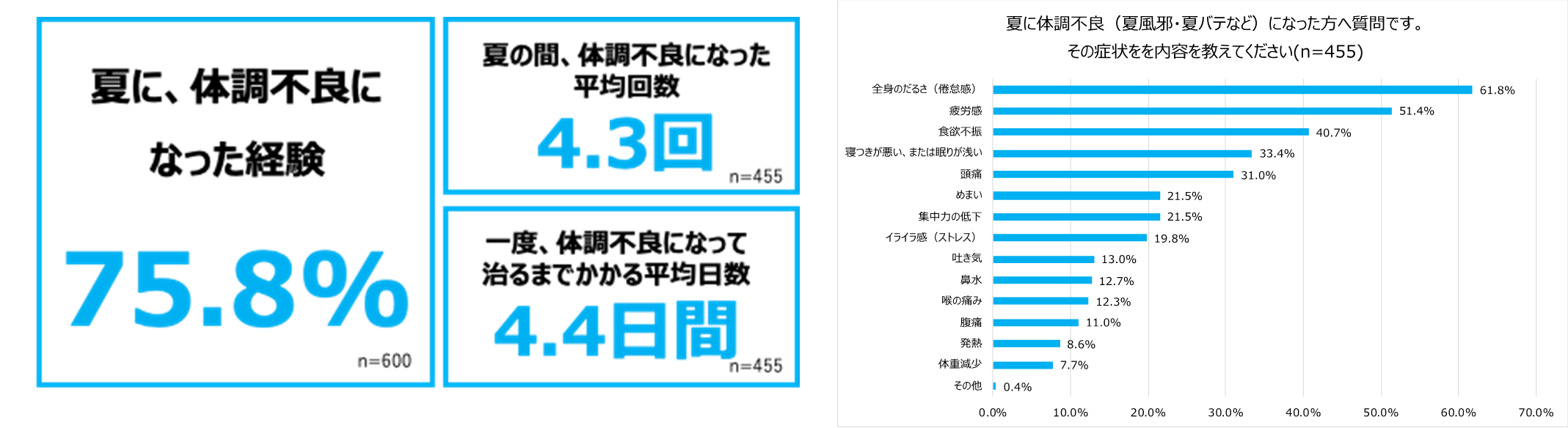 ●7割以上が夏の体調不良を経験。6〜8月で平均4回以上、一度体調不良になると平均で4日間以上続く結果に。