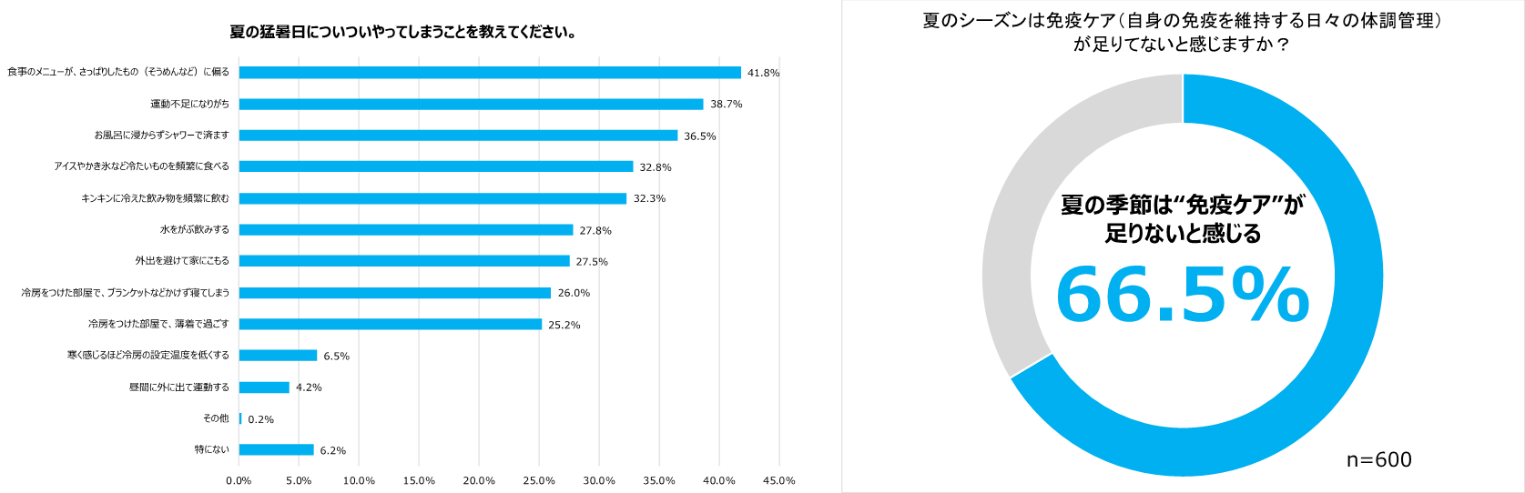 夏の暑さが継続することによるストレスが免疫を低下させる”猛暑ストレス”について質問したところ、約7割が「知らない」と回答しました。また「夏の猛暑日についついやってしまうこと」については、1位は「食事のメニューが、さっぱりしたもの(そうめんなど)に偏る」(41.8%)、2位は「運動不足になりがち」(38.7%)3位は「お風呂に浸からずシャワーで済ます」(36.5%)の順となりました。このような暑い日ならではの行動は免疫低下につながり、“猛暑ストレス”に陥りやすいと考えられます。