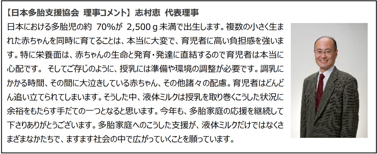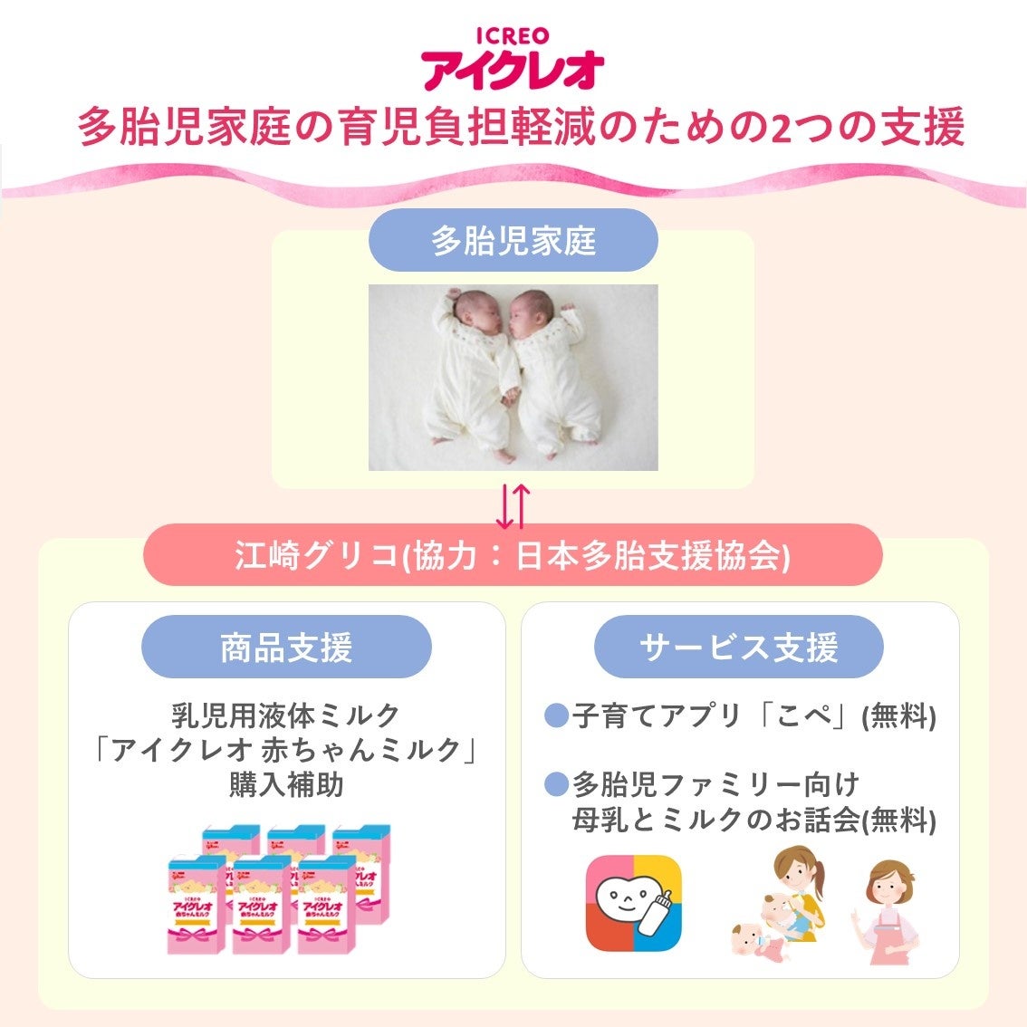 江崎グリコ株式会社は、一般社団法人 日本多胎支援協会(所在地:兵庫県神戸市)と連携し、2020年7月に開始した多胎児家庭向けの「液体ミルク」の購入補助支援を、2025年7月14日まで延長します。本取り組みは今回で5年目を迎え、今後も引き続き、商品・サービスを通じて、子どもの心身の健康の支援に努めてまいります。