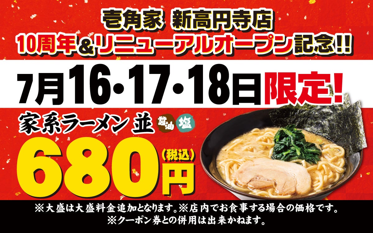 「壱角家 新高円寺店」は、2014年にオープンし、今年で10周年を迎えます。それに伴い、2024年7月16日(火)~7月18日(木)の3日間限定でリニューアルオープンキャンペーンを実施します。