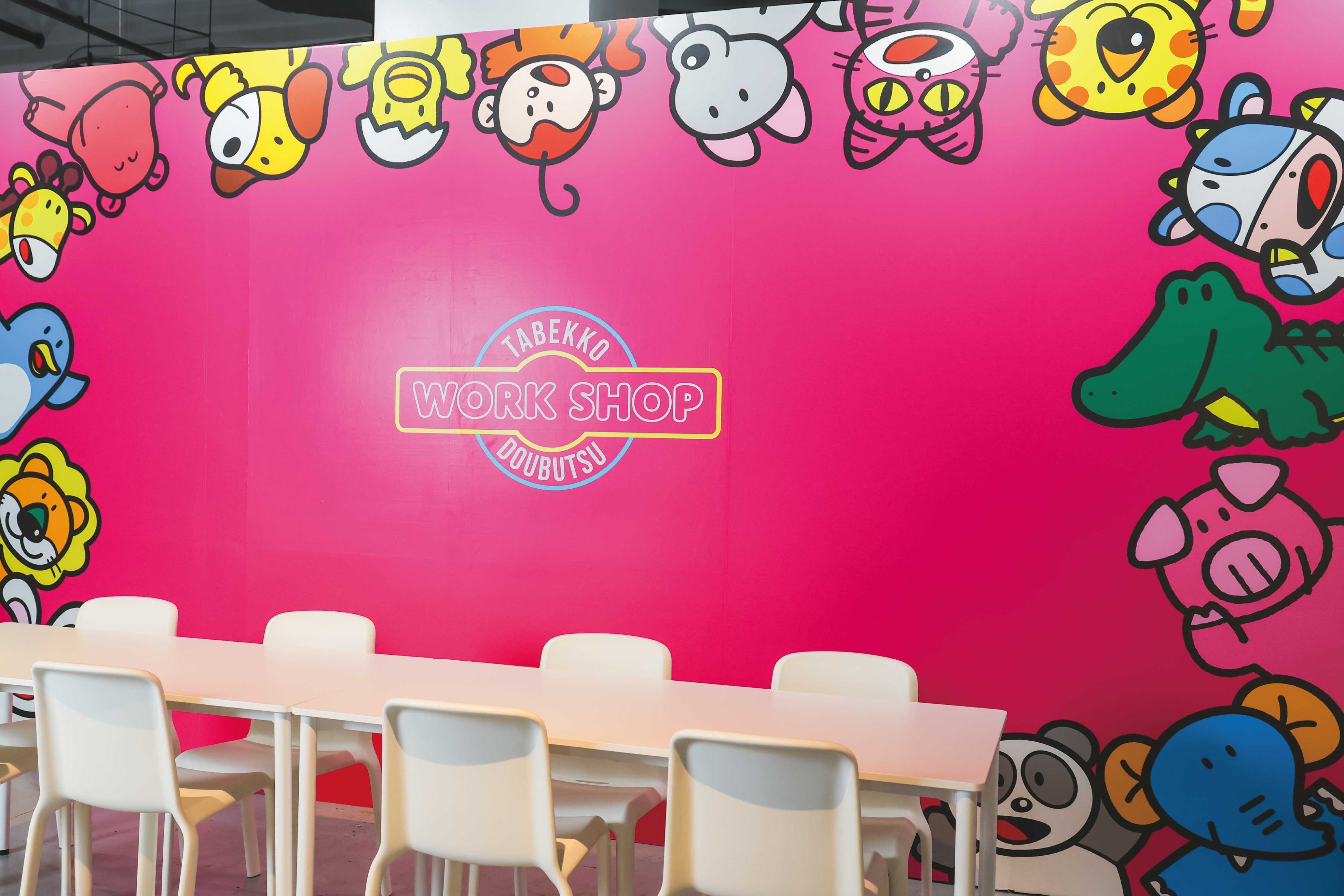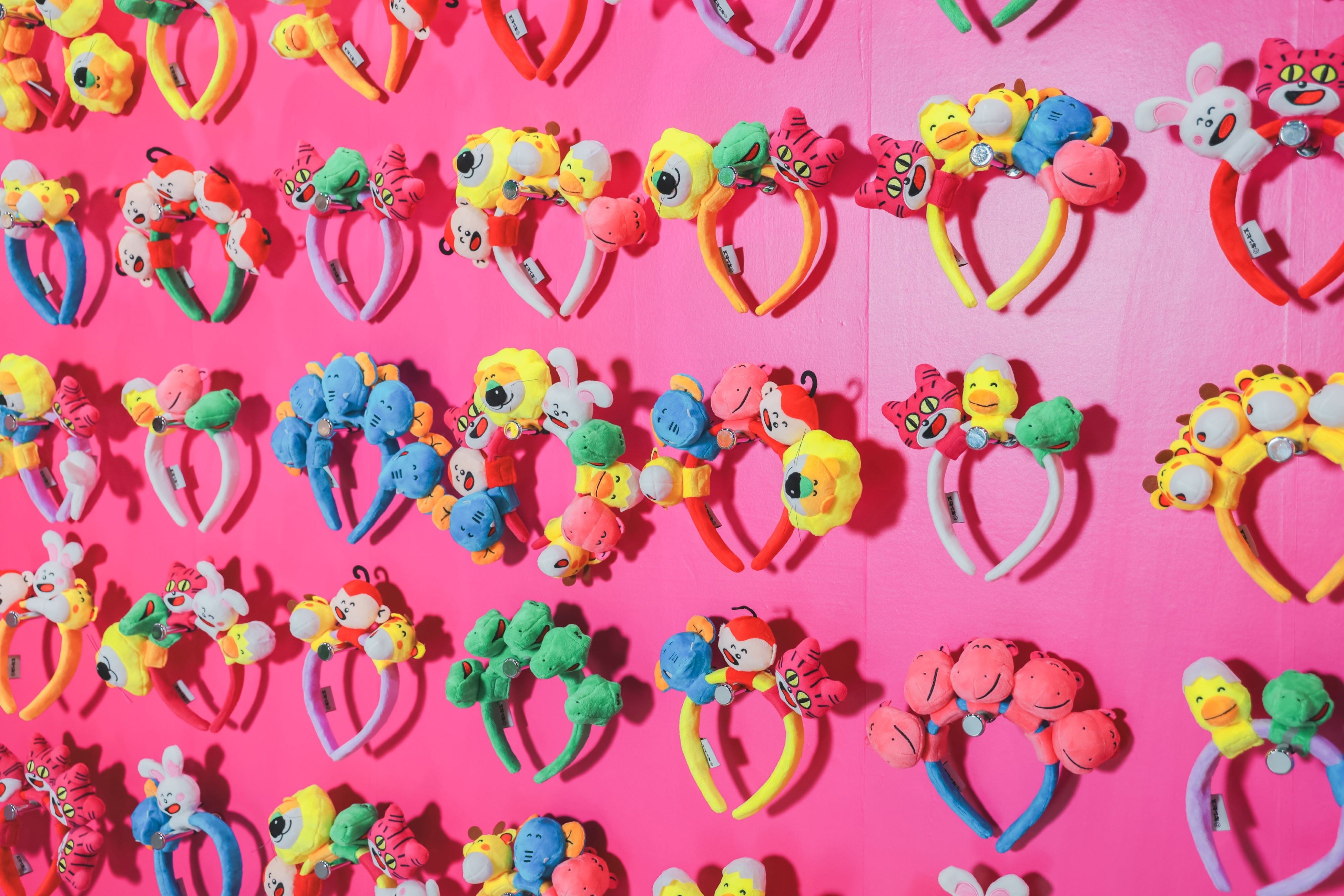 ビビットなピンクの壁に並ぶのは、個性的なカチューシャのディスプレイ。今回『たべっ子どうぶつLAND』では、チケット購入者を対象に入場ノベルティとして「カチューシャベース」(全8色・ランダム)をプレゼント。