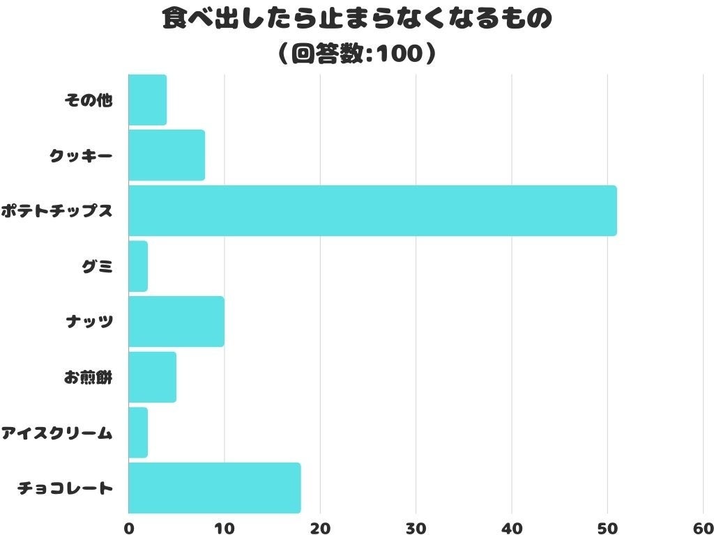 食べ出したら止まらなくなるものをアンケートにて調査したところ、1位は「ポテトチップス」でした。