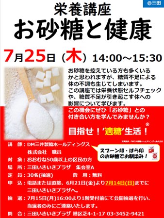 ※栄養講座へのお申込およびお問合せは、上図に記載の通り、三田いきいきプラザ(東京都港区、03-3452-9421)までお願いいたします。DM三井製糖HDおよびDM三井製糖において、お申込者の個人情報をお預かりすることはありません。