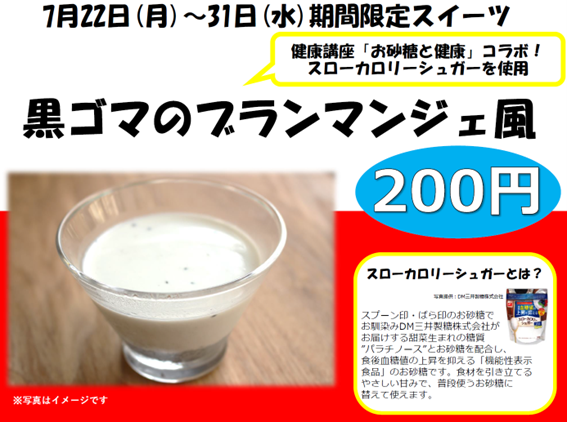 三田いきいきプラザに併設されている「まーぶるカフェ」にて、食後血糖値の上昇を抑える「スローカロリー」を意識したスイーツ「黒ゴマのブランマンジェ風」を栄養講座の時期に合わせて販売予定です。栄養講座にてお伝えする「適糖生活Ⓡ」を食生活に取り入れていただく第一歩として、「まーぶるカフェ」をご利用いただければと思います。「まーぶるカフェ」はどなたでもご利用いただくことが可能ですが、本スイーツは数量限定となっています。