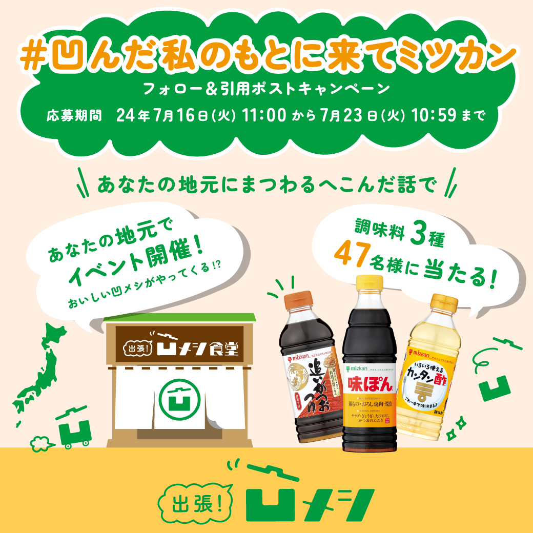 皆様の声を聞く中で、まだまだたくさんのへこんでいる人が日本中にいると考え、「出張凹メシ」を実施することを決定いたしました。7月16日(火)から7月23日(火)までX上で「#凹んだ私のもとに来てミツカン」キャンペーンを行い、全国からその都道府県ならではのへこんだエピソードを募集します。キャンペーンでの投稿をもとに実際にミツカンが出張する場所を決定し、へこんだ気持ちが元気になるよう、出張先の地域でおいしいごはんを提供するイベントとなっております。