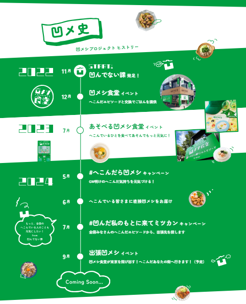 「凹メシ」プロジェクトの2024年の活動として、5月にはGW明けや新生活でへこんでいる人に凹メシを届けるX(旧Twitter)キャンペーン、6月には直接凹メシをお渡しする配布イベントを実施し、皆様をごはんの力で元気づけて参りました。