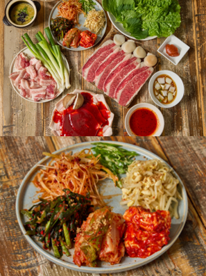 本格韓国焼肉ディナーのメインとなる、“オーギョプサル”。オーギョプサルのオ(오)は数字の「5」、겹(ギョプ)が「重なった層」のことで、살(サル)が「お肉」を表し、豚バラ肉を5枚肉(皮・脂・肉・脂・肉)にして焼いて食べる豚バラ焼肉のことです。オーギョプサルは皮付きで、サムギョプサルより分厚いのが特徴です。噛むごとに皮と肉の間の脂が口いっぱいに広がります。また韓国でメジャーな焼肉の一つ、“チャドルバギ”も登場いたします。高級食材とされるチャドルバギ(牛あばら肉の薄切り)を北海道産のホタテと一緒に焼き上げます。牛肉と魚介の旨味が合わさり、より深いコクを感じていただけます。本場韓国の焼肉は、キムチやナムル、辛ネギなどの8種のパンチャン(小皿料理)と一緒に、サンチュやエゴマの葉の新鮮な生野菜に巻いて食べます。ビタミンB1が豊富な皮つき豚肉とビタミンB1の吸収を助けるアリシンをたっぷり含んだネギなどのお野菜をバランスよく食べることで、疲労回復効果や夏バテ防止効果が期待できる暑い夏にぴったりなコースです!