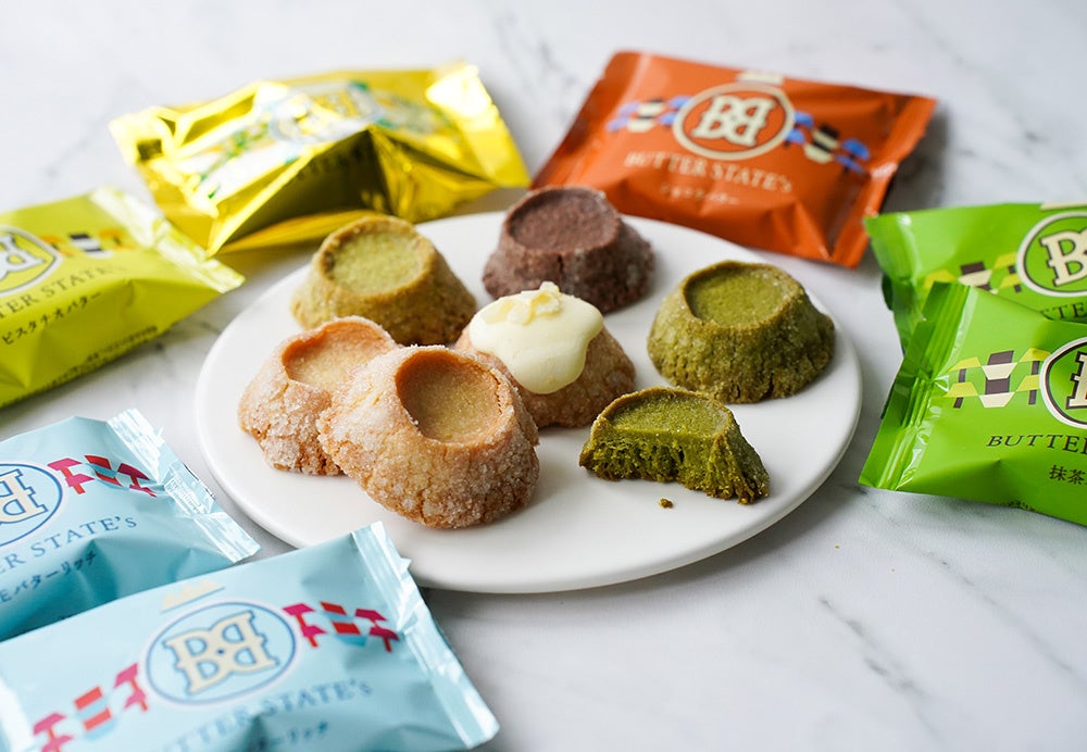 【内 容】バターステイツクッキー(THEバターリッチ・抹茶バター 各2個、ショコラバター・ピスタチオバター 各1個)、バターステイツ THEフォンデュチーズ&レモン 1個
