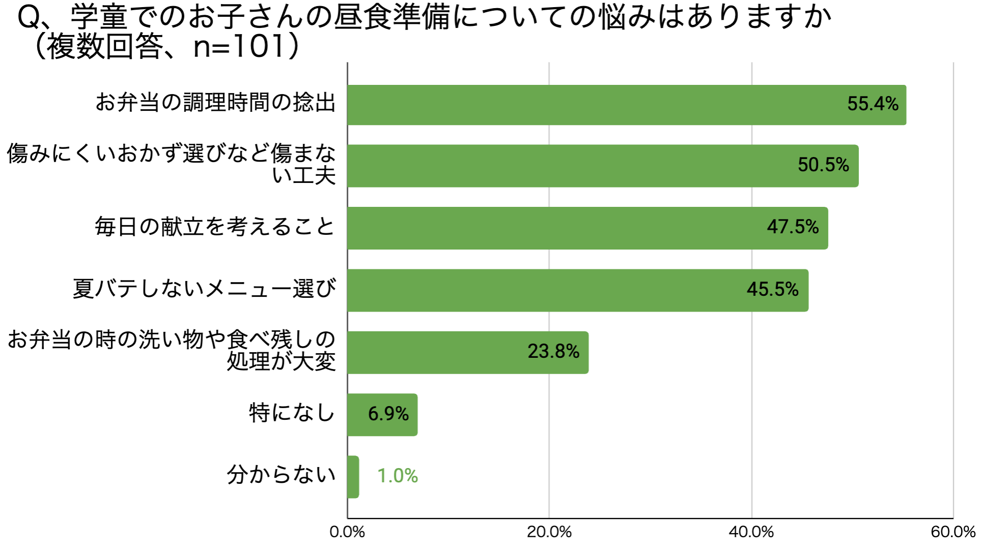 学童保育で昼食準備をする際に、悩みのない方は少なく、”調理時間の捻出”や”傷みにくいおかず選び・工夫”などについて、約半数の方が悩んでいる結果でした