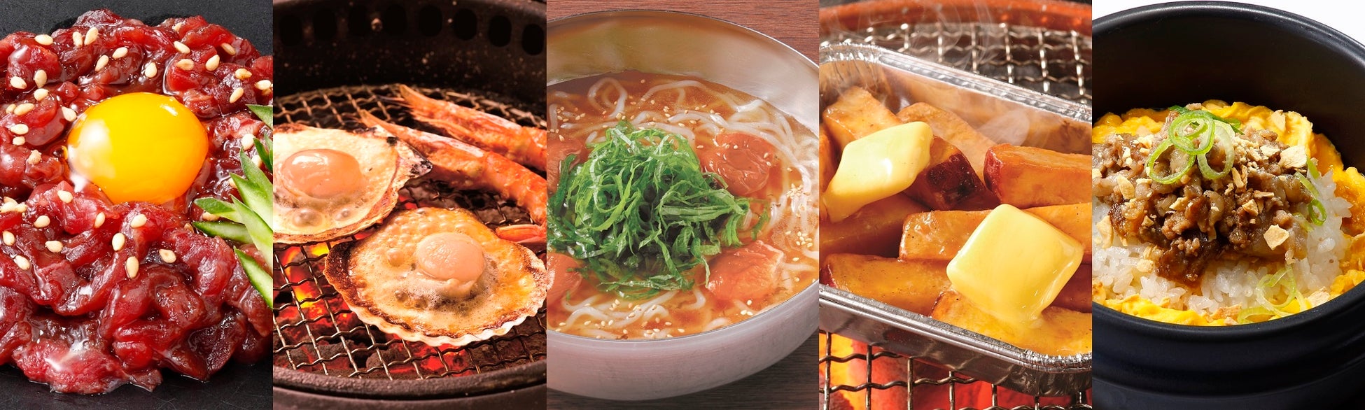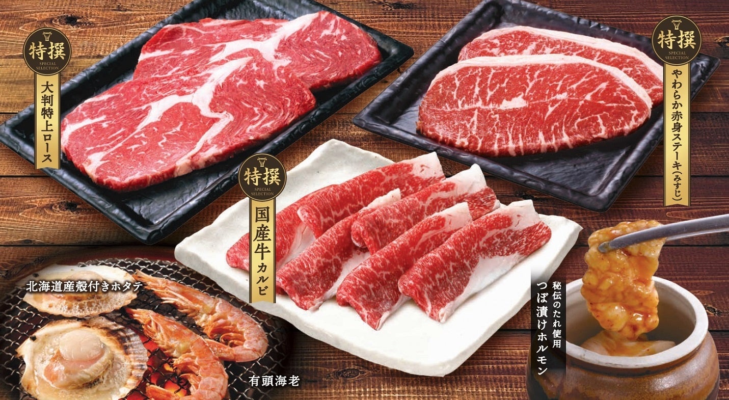 国産牛や上焼肉、北海道産殻付きホタテや有頭海老まで楽しめるワンランク上の食べ放題コース