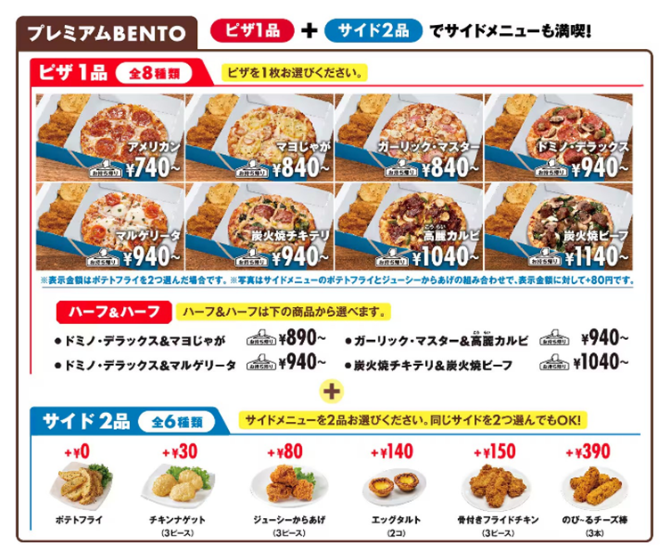 ピザとサイドメニューがセットになった「ピザBENTO」の選べるピザは、ロングセラーのドミノ・デラックスや王道人気のマルゲリータ、ガーリック・マスター&高麗カルビや、炭火焼チキテリ&炭火焼ビーフなど、人気ピザ全12種類。サイドメニューはポテトフライ、ジューシーからあげ、チキンナゲット、デザートも含めた全6種類から自由に組み合わせられます。自分だけの「ピザBENTO」であれば、ランチや夕食、選択肢が狭まる夜食のマンネリからの脱出に一役買うこと間違いなしです。