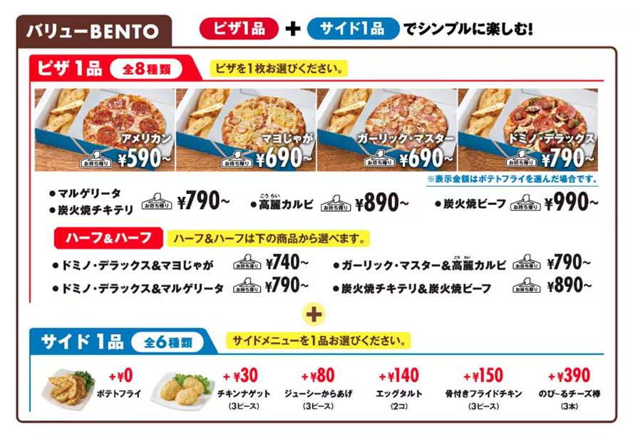 「マイドミノ」は、2023年2月の販売開始以来、販売累計620万食を突破している、おひとり様サイズのピザとサイドメニューが楽しめる大人気商品です。ドミノ・ピザでは、もっと気軽にお手軽に、外出先や出張先、旅の途中などでも食べていただきたい、という想いから、食べきりになるサイズにこだわってピザのサイズを直径18㎝から15cmにコンパクト化。さらに、お腹の空き具合に合わせてサイドメニューをもっと自由にお選びいただけるよう、ピザ1品とサイドメニュー1品が選べる「バリューBENTO」と、ピザ1品とサイドメニュー2品が選べる「プレミアムBENTO」の2カテゴリーをご用意しました。そして、もっと気軽に、心置きなく、毎日楽しんで欲しいという思いから、ピザとサイドメニューのセット価格をお持ち帰り590円~、デリバリー890円~に設定しました。追加料金で、お好きな商品が選択可能なので、毎日の気分に合わせてピザとサイドメニューの組み合わせをお楽しみいただけます。