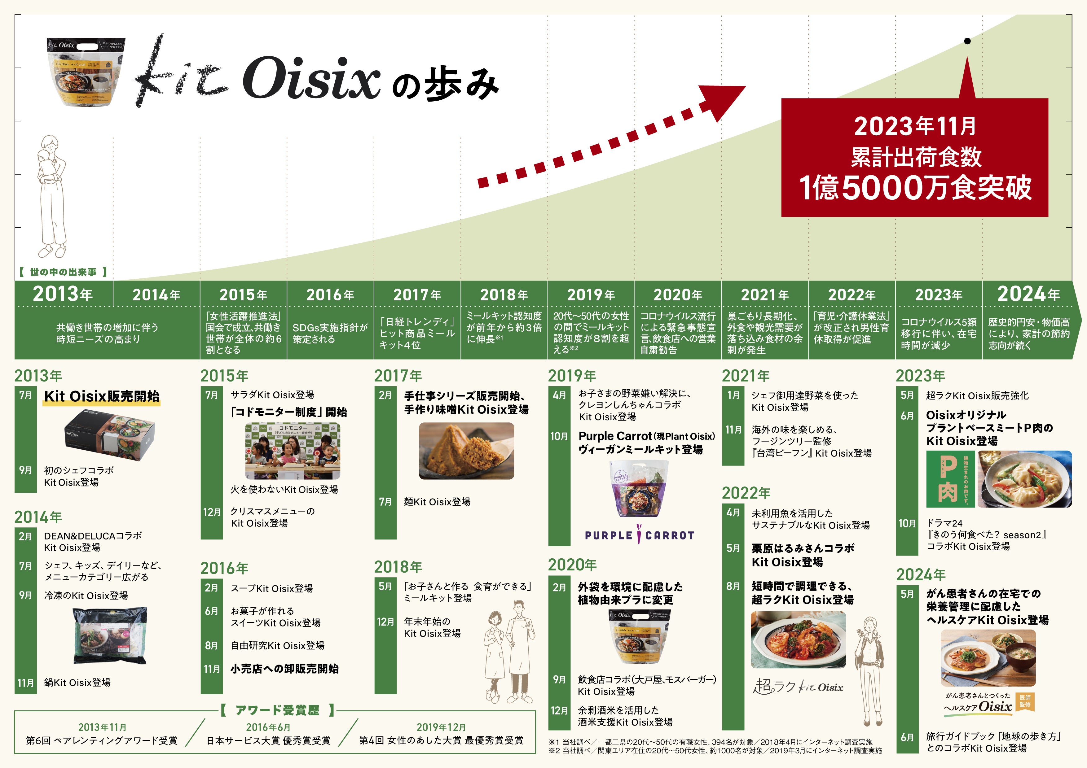 2000年に設立。「つくった人が自分の子どもに食べさせられる食材のみを食卓へ」をコンセプトとした、有機野菜や特別栽培野菜など、できる限り添加物を使用せずに作った加工食品などの食品を取り扱うEC食品宅配サービスです。現在、会員数は368,714人(2024年3月末時点)で日本全国の方にご利用いただいています。2013年7月に販売を開始した、必要量の食材とレシピがセットになり主菜と副菜の2品が20分で完成するミールキット『Kit Oisix』は、シリーズ累計出荷数が1億5千万食(2023年5月末時点)を突破しています。