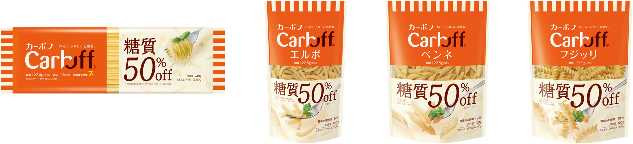 糖質50%オフ(※)でありながら、パスタらしい食感をお楽しみいただける低糖質パスタ『Carboff』シリーズは、ロングパスタ・ショートパスタともに多彩なラインナップを取り揃えています。