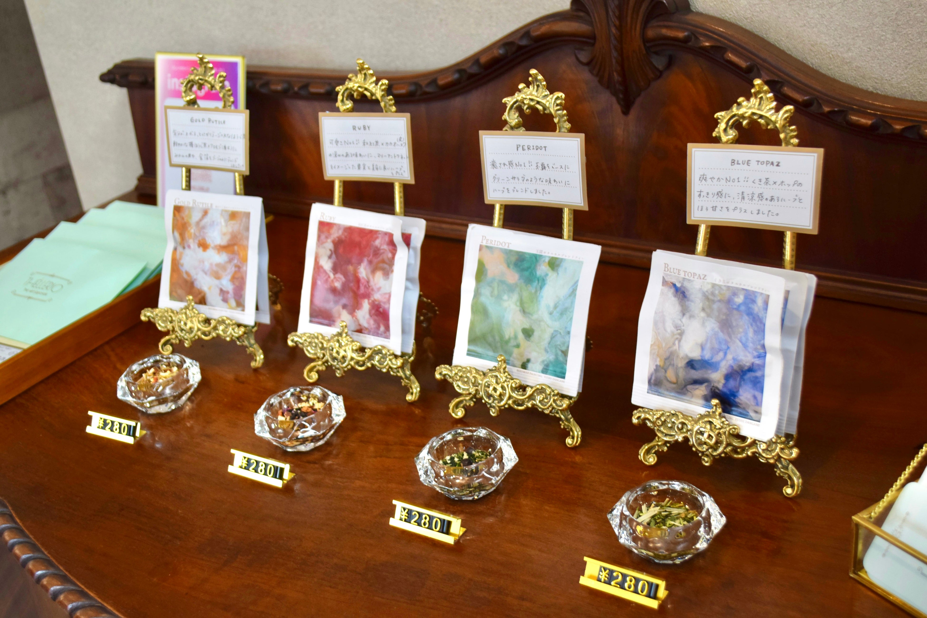それぞれのお茶には宝石の名前を商品名に。それぞれの宝石のイメージを味や香りで表現したティー。