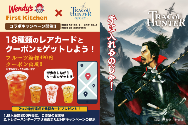 期間中全店にて「銀ピン」が出現しUR(ウルトラレア)以上のNFTカードがGET出来る他、同日発売した新商品「フルーツ粉粿(フングイ)」のクーポンピンも出現!更に、800円毎のお買い上げでリアル武将トレーディングカード(ノーマル・レア・スーパーレアのいずれか)が1枚もらえます。各店数量限定200枚となっていますのでお早めにGETして下さい。猛暑の夏にカードをGET!そして爽やかドリンクで水分補給!! トレクーハンターの世界へ、、いざ出陣!