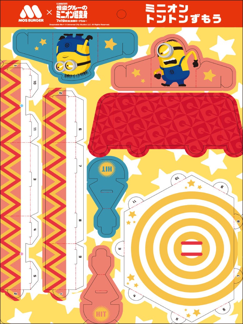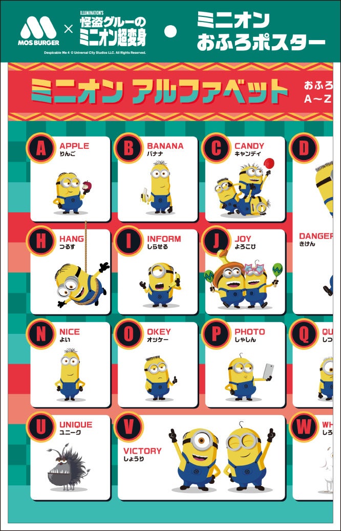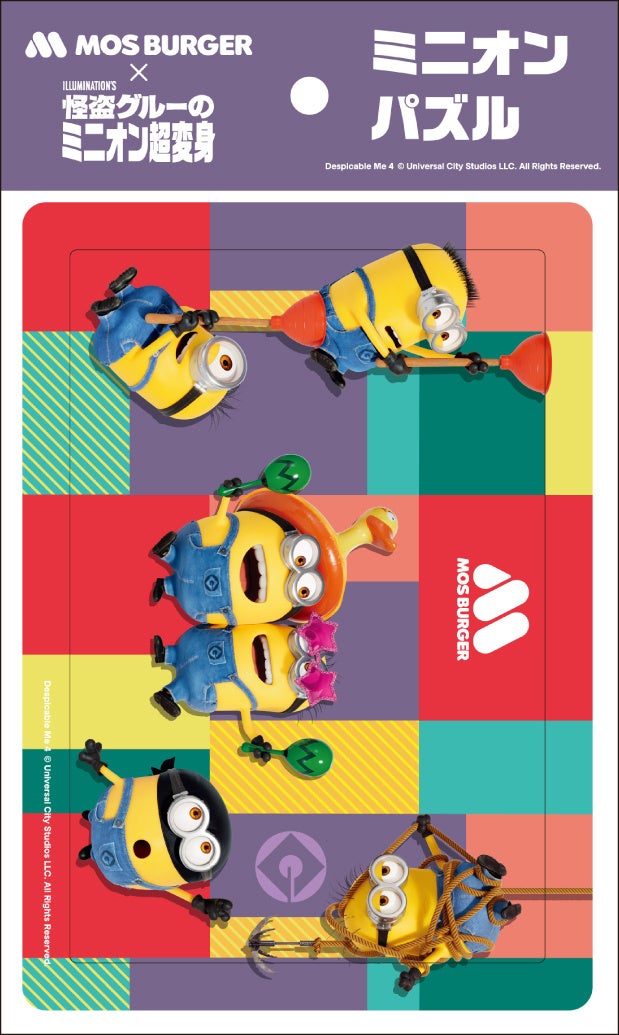今回の“ミニオン”コラボおもちゃは、ミニオンと一緒に楽しくアルファベットが学べるおふろポスター、たくさんのミニオンがデザインされたカラフルなパズル、ミニオン同士を戦わせて遊べる ペーパークラフトのトントンずもうの 3 種類です。対象のお子さま向けのモスワイワイセットや低アレルゲンメニューのセットのご購入で、お好きなおもちゃを 1 つお選びいただけます※2。