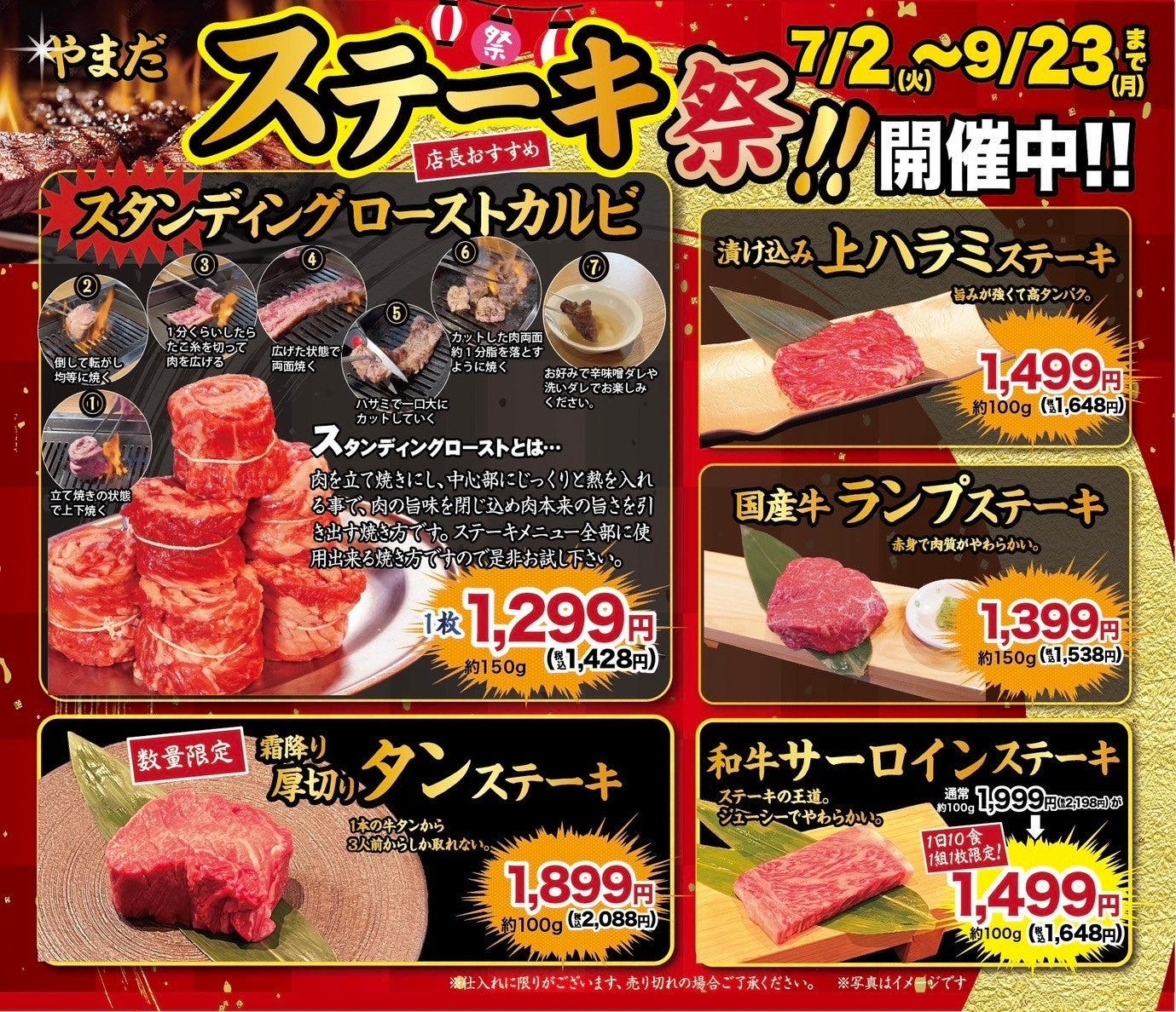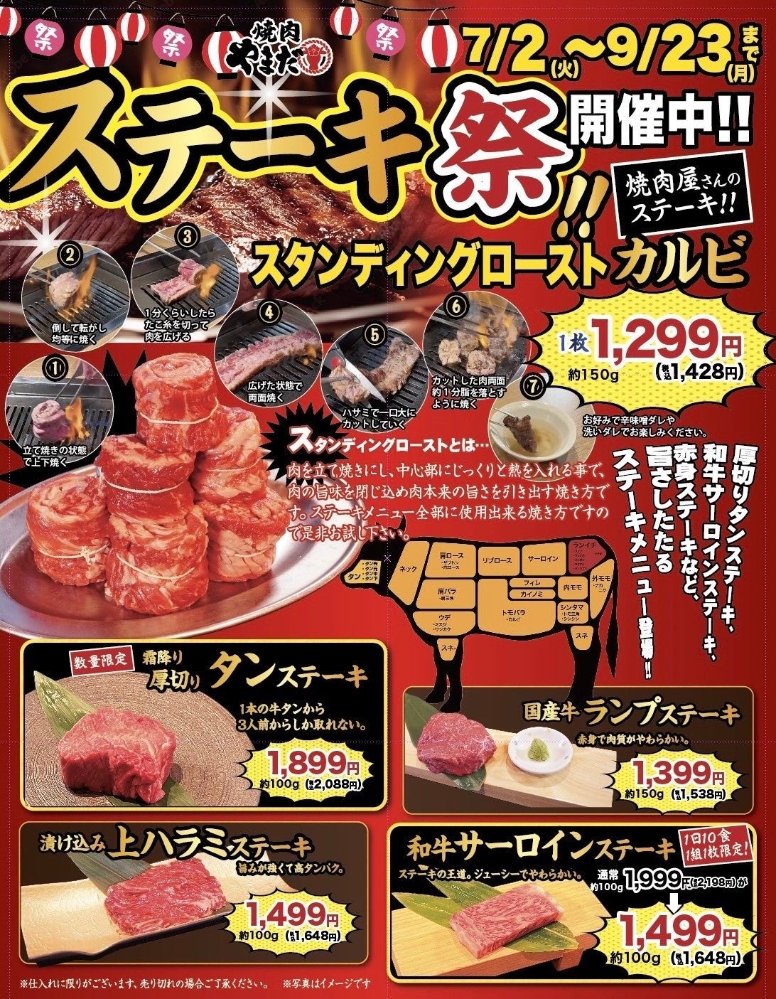 焼⾁屋だからこそ、さまざまな部位の⾁を今までにない焼き⽅で⾷べられるステーキ祭り!!⼤⼈気のカルビや漬け込みハラミをはじめ、霜降り厚切りタン・国産⽜ランプ・和⽜サーロインのステーキが新登場!
